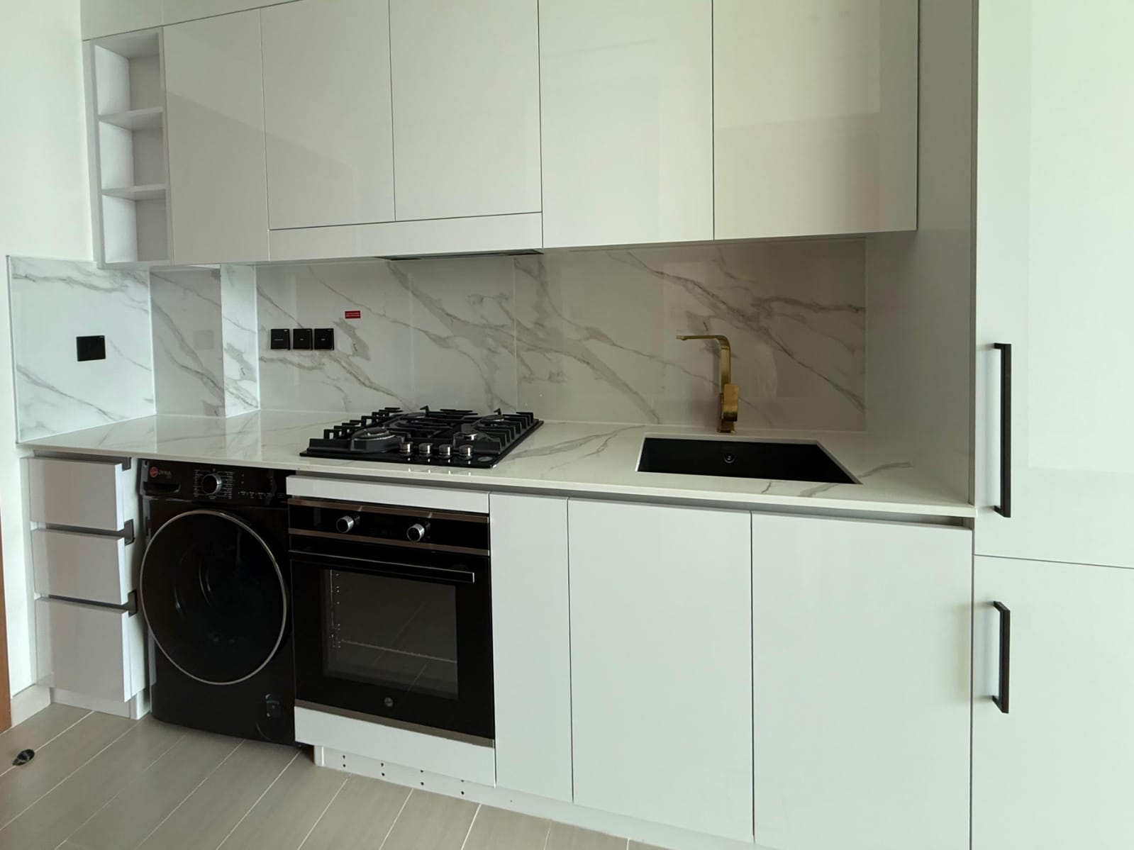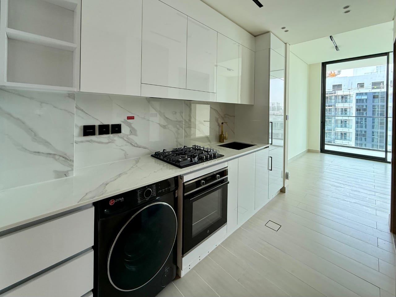 The apartment features a bright studio layout with large windows allowing natural light, a private balcony, built-in wardrobes, and a fully fitted kitchen with high-quality cabinetry. The modern bathroom is elegantly finished, offering a stylish yet functional living space.